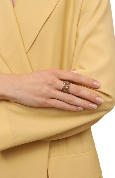 Золотистое кольцо изготовили из латуни с антикоррозийной обработкой. Аксессуар дополнили накладкой в форме листа, закрывающей фаланги трех пальцев.