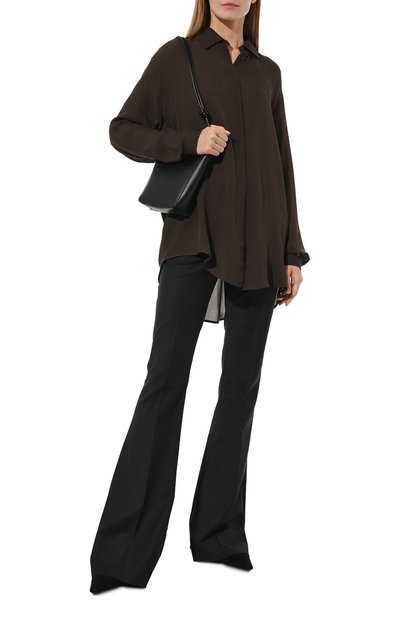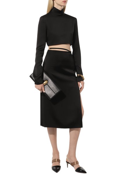 Остроносые туфли на невысоком фигурном каблуке сшили из текстиля с полосатым узором. Единую конструкцию из перемычки и ремешка на заднике дополнили тремя эластичными вставками сзади.