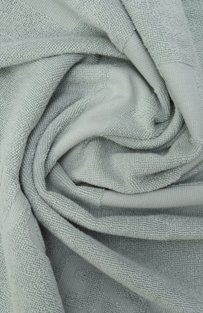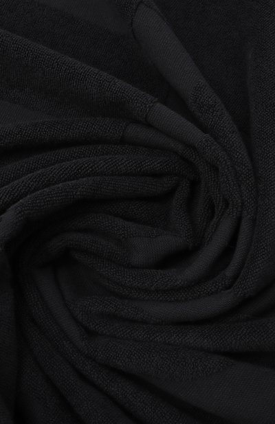 Банное полотенце выполнили из хлопкового терри. Края подчеркнули широким контрастным кантом, а по центру расположили логотип с вписанным в него анималистичным узором.