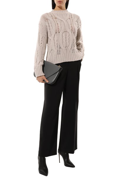 Свитер с сотовым узором связали из кашемировой пряжи в пять сложений. Модель с имитацией рельефных швов на спущенной линии плеч органично дополнит и повседневный образ с джинсами, и более элегантный — с юбкой или классическими брюками.