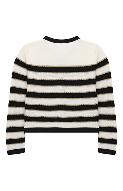 Кардиган в разноцветную полоску связали из шерсти первого пострига. Ребристые манжеты, пояс, V-образный вырез и планку с пуговицами Medusa оставили однотонными. По бокам предусмотрели карманы.