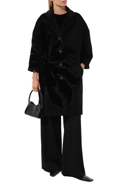 Полупальто-кокон со спущенной линией плеч сшили из переработанной шерсти double-face, без подклада. Модель с боковыми карманами и рукавами на молниях дополнили широким шалевым воротником, трансформирующимся в неглубокий капюшон.