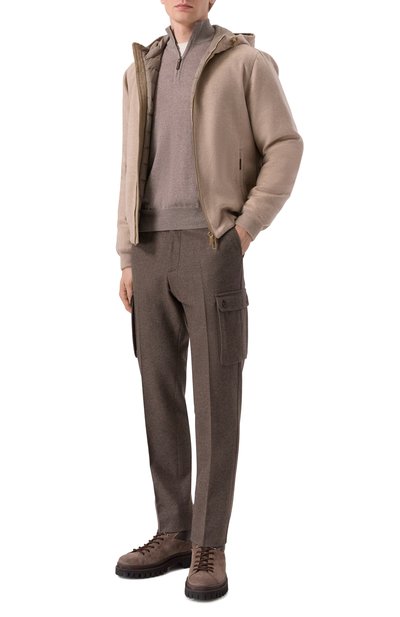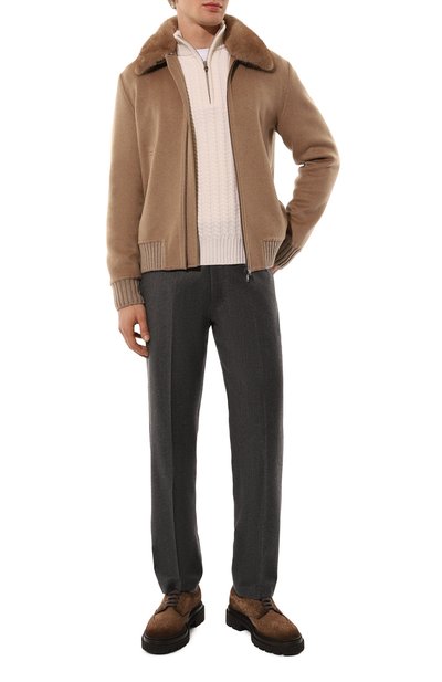 Бомбер с врезными карманами по бокам выполнили из кашемира, а широкий отложной воротник изготовили из меха норки. Модель с ребристыми поясом и манжетами застегивается встречной молнией.