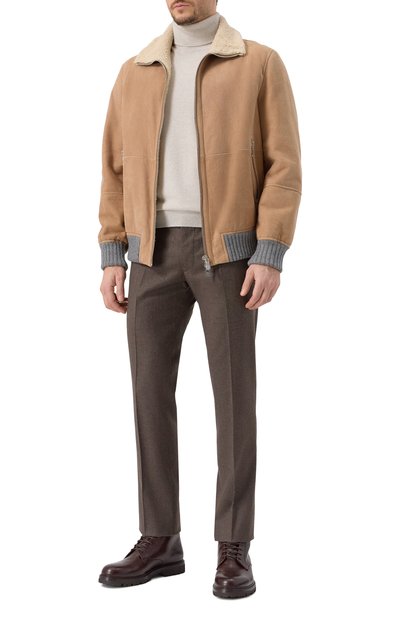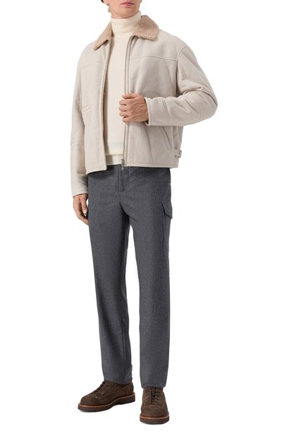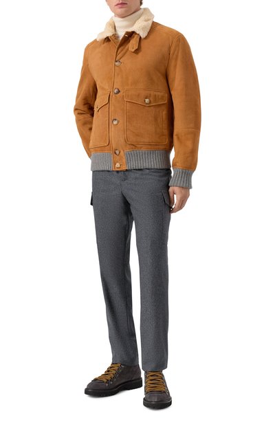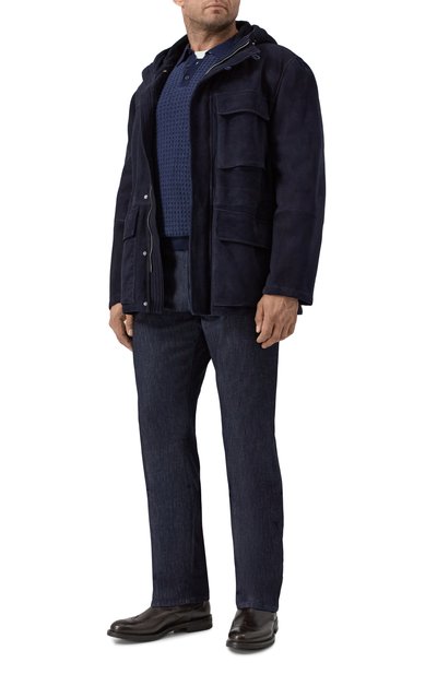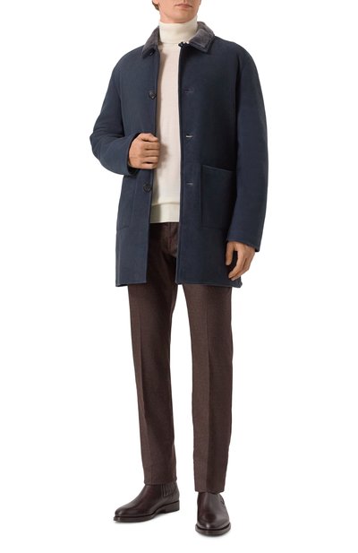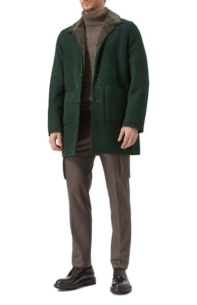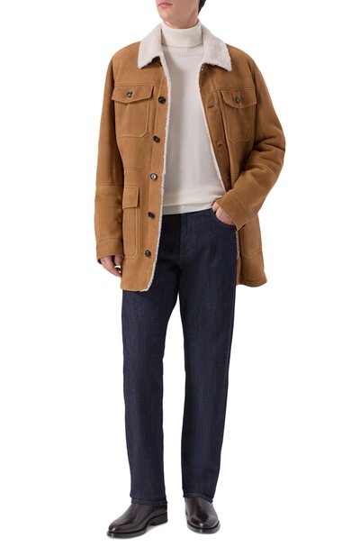 Дубленку с замшевой внешней стороной и коротким плотным ворсом внутри сшили из тщательно выделанной вручную овчины. Модель с внутренними и внешними боковыми и нагрудными карманами с клапанами застегивается роговыми пуговицами.