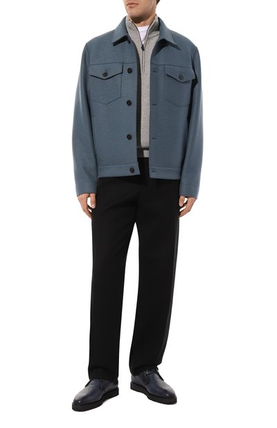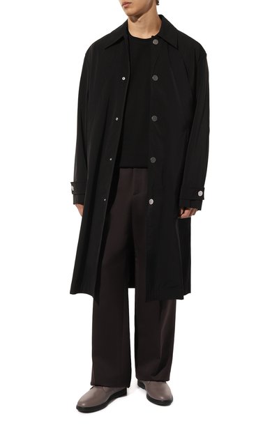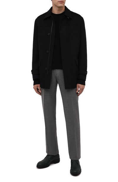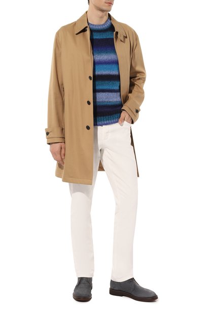 Дезерты с миндалевидным мысом выполнили из замши. Ботинки с кожаными шнурками и внутренней отделкой поставили на подошву с контрастными стежками и протектором из ТПУ.