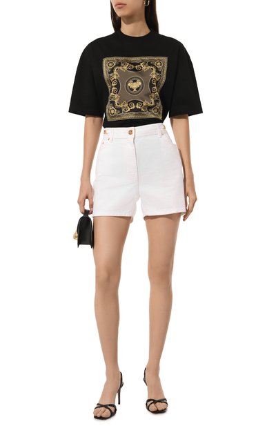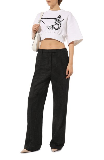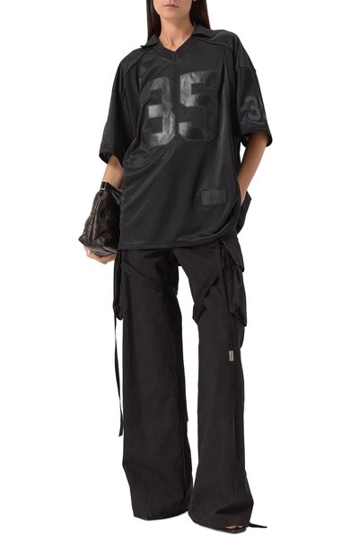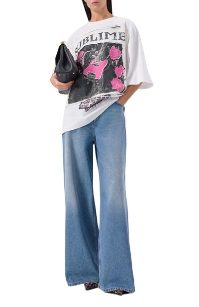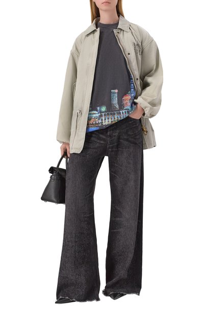 Футболку с круглым вырезом и спущенной линией плеч сшили из неравномерно выбеленного хлопкового джерси. Спереди модель украсили брендированным принтом, краска на котором будто потрескалась со временем.