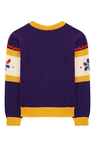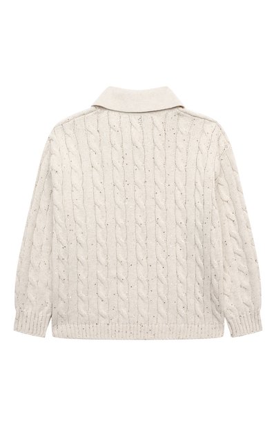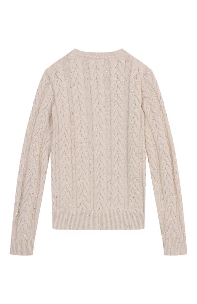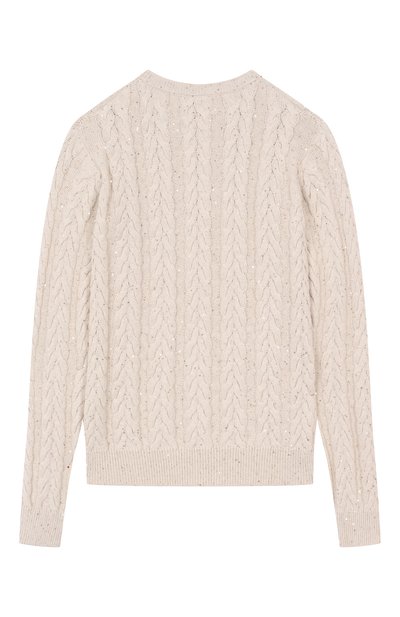 Пуловер с арановым узором связали из кашемировой пряжи. Вышитую эмблему Solomeo спереди и отделку круглой горловины и манжет выполнили ламинированными нитями.