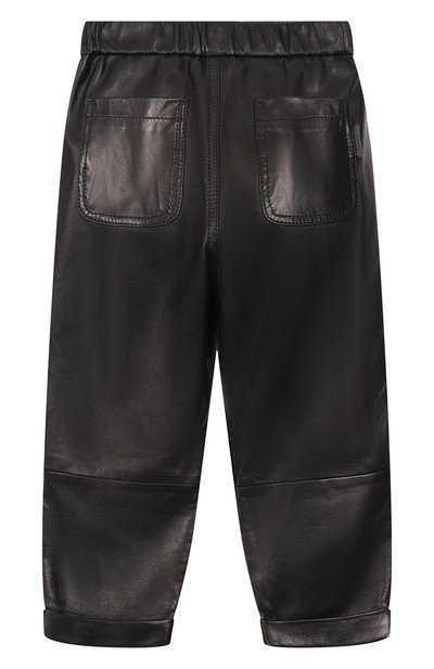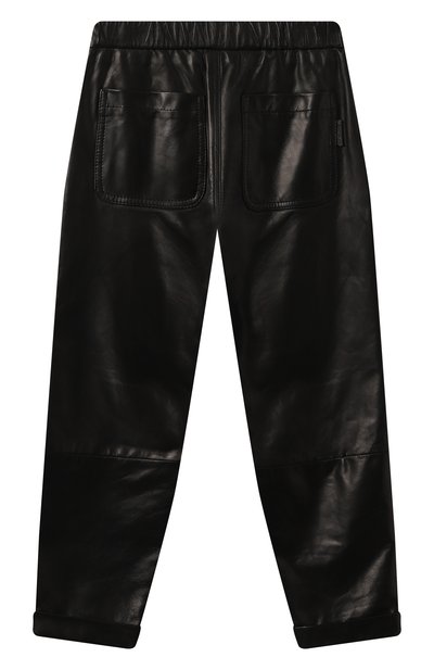 Брюки с поясом-кулиской и отворотами на брючинах выполнили из зернистой кожи. Один из четырех карманов украсили небольшим ярлыком из знаковой для марки цепочки мониль.