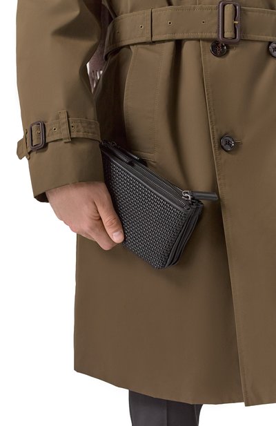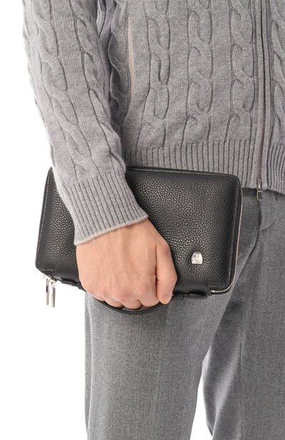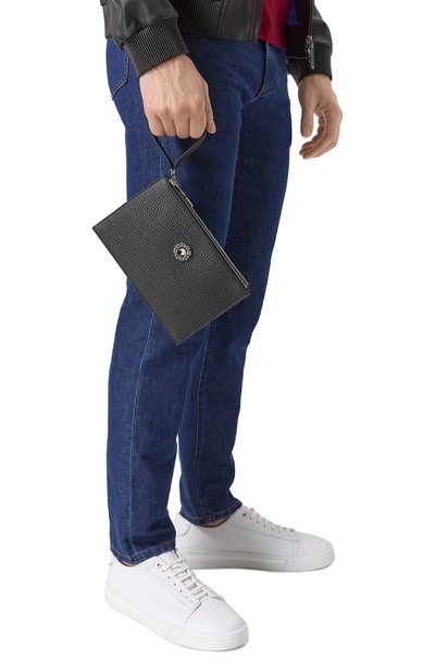 Борсетку с ручкой-петлей сбоку и фирменной накладкой спереди сшили из телячьей кожи. Одно из трех отделений, застегивающихся молниями, дополнили тремя слотами для карт.