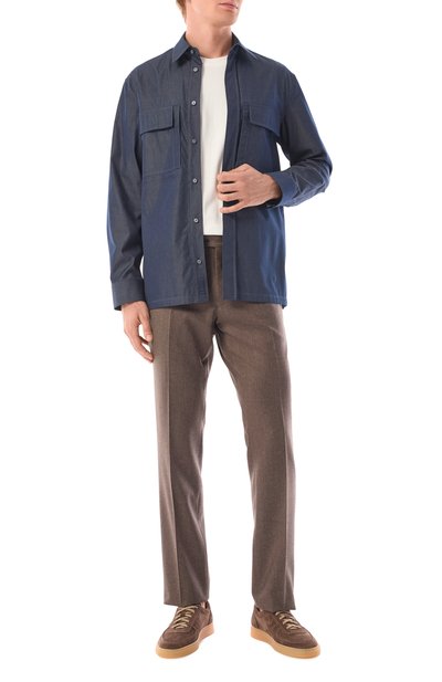 Рубашку на кнопках сшили из хлопковой ткани Cashco с небольшим добавлением кашемира. Модель с закругленной линией низа дополнили двумя накладными нагрудными карманами с клапанами.