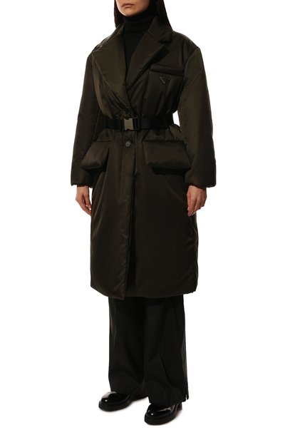 Пуховик с объемным капюшоном и фирменной нашивкой внизу дополнили внутренним и двумя внешними карманами с клапанами и боковыми входами. Пальто из вторичного полиэстера, утепленное переработанным гусиным пухом, застегивается встречной молнией.