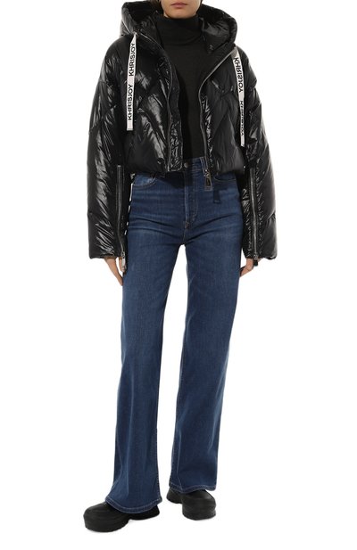 Стеганую куртку Corazon на пуху белой утки сшили из непродуваемого нейлона, а высокий ворот и широкие манжеты — из трикотажа в рубчик. Модель с фигурным низом и отделкой из овчины дополнили накладными карманами в форме сердца.