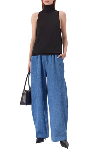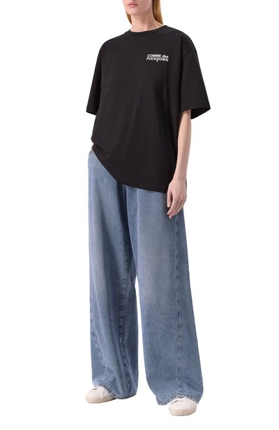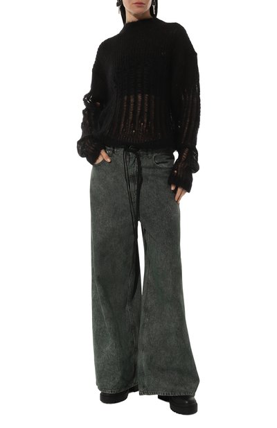 Окрашенные в готовом виде джинсы оттенка Musk Green дополнили четырьмя карманами, вышив на заднем накладном логотип марки. Широкую модель из жесткого денима оснастили регулируемым ремнем с металлической пряжкой.