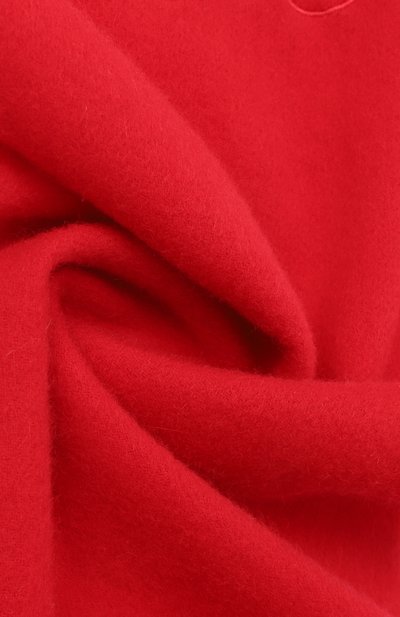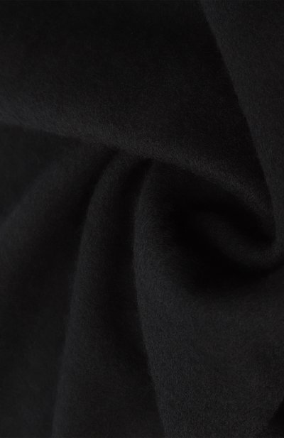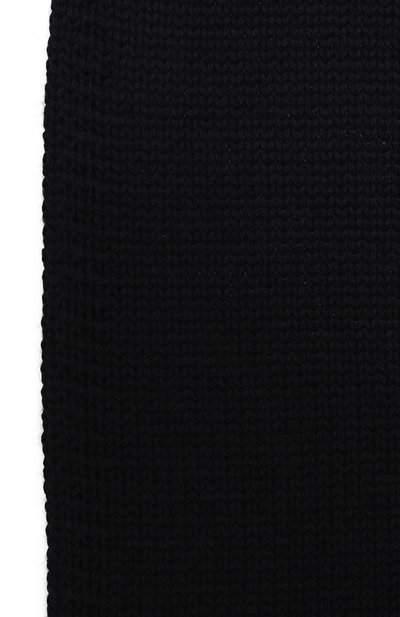 Шерстяной шарф украсили интарсионным узором в виде головы оленя. Рядом с ним закрепили брендированную пластину, а края аксессуара подчеркнули обметочным швом.