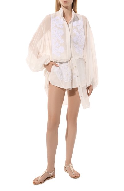 Для изготовления коротких шортов с эластичным поясом использовали хлопок с добавлением шелка. По бокам модель украсили рельефным цветочным узором в тон.