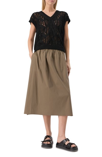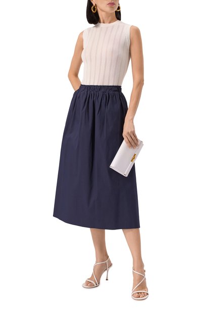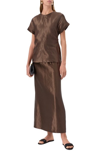 Макси-юбка с подкладом сшита из полупрозрачной хлопковой ткани с добавлением шелка. Модель с боковыми карманами и поясом-кулиской предлагаем сочетать с парной блузой.