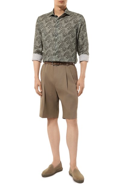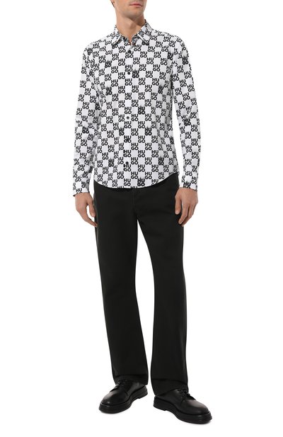 Рубашку Ermo кроя Slim fit сшили из хло пкового поплина с паттерном из логотипов марки. Модель с воротником кент, регулируемыми манжетами и фигурным низом застегивается брендированными пуговицами.