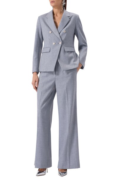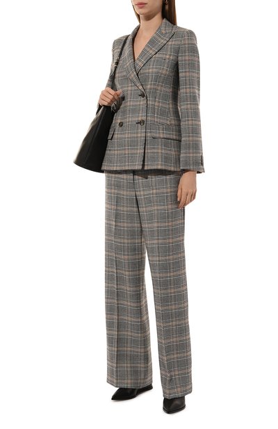 Брюки со средней посадкой и стрелками сшиты из мягкой полушерстяной ткани с узором «пье-де-пуль». Модель прямого кроя дополнена четырьмя врезными карманами и поясом со шлевками для ремня.