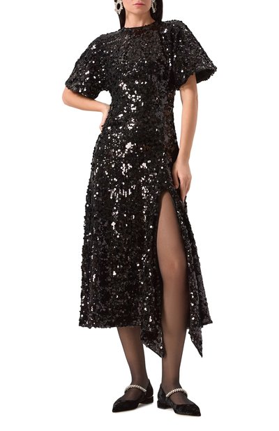 Платье с V-образным вырезом с завышенной линией талии, подчеркнутой драпировкой, сшили из эластичного полиэстерового бархата. Спереди по всей длине модель дополнили объемными пуговицами с небольшими стразами в тон.