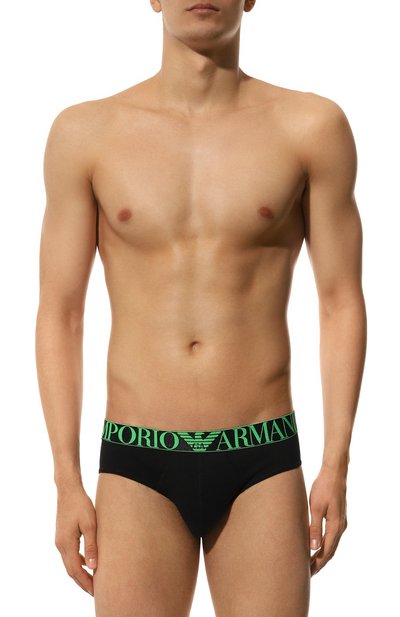 Брифы из джерси стрейч на основе органического хлопка вошли в коллекцию Armani Sustainability Values. Модель с плоскими оверлочными швами дополнили контрастным эластичным поясом с брендированным мотивом. В комплекте – два идентичных изделия.