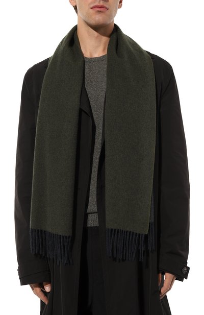 Широкий шарф выполнили из ворсистого кашемира с добавлением шерсти. Модель украсили контрастным логотипом марки, в тон которому — бахрома по краям изделия.