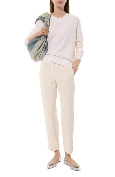 Своб одный пуловер с круглой горловиной в рубчик и спущенной линией плеч связали из смесовой пряжи на основе шерсти альпака. Рукава украсили цветочной вышивкой.