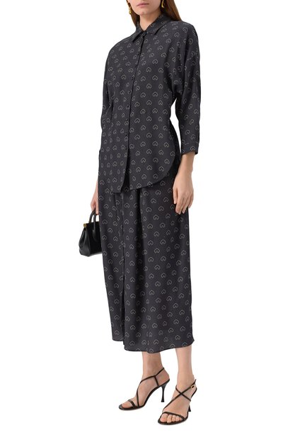Драпированное платье с объемными рукавами сшили из цветочной вискозной ткани с добавлением шерсти. Модель с завязками на глубоком каплевидном вырезе спереди комфортно носить и на голое тело, и поверх водолазки.