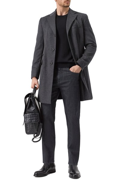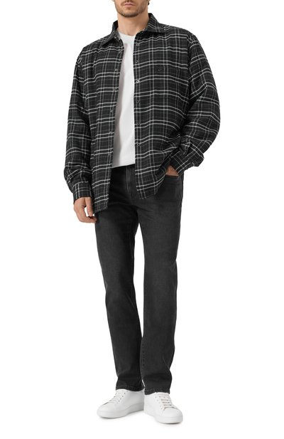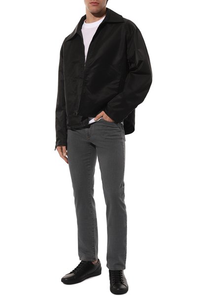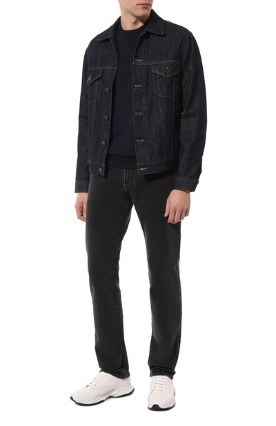 Джинсы с пятью карманами выполнили из хлопка с добавлением эластана. На поясе модели со средней посадкой расположили брендированный кожаный жакрон.