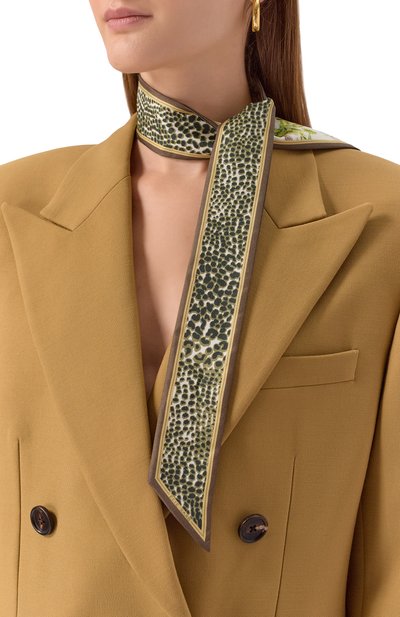 Шарф-твилли с принтом и скошенными краями выполнен из шелка. Аксессуар можно не только носить на шее, но и украсить им ручку сумки.