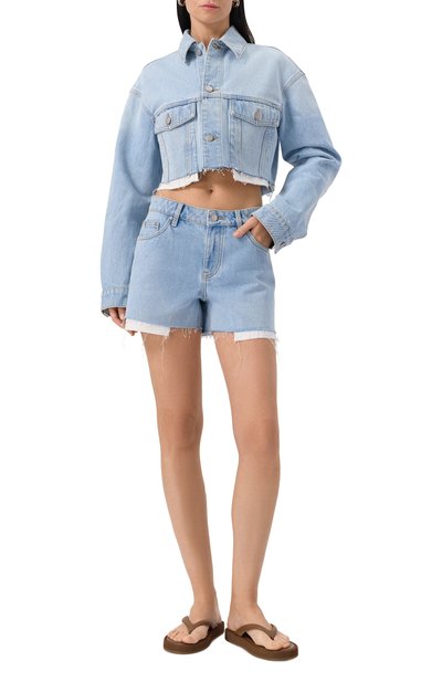 Джинсовую куртку с регулируемыми патами на поясе, боковыми и нагрудными накладными карманами с клапанами обработали лазером, чтобы выбелить и сформировать потертости. Модель кроя oversize выполнили из облегченного хлопкового денима с добавлением лиоцелла.