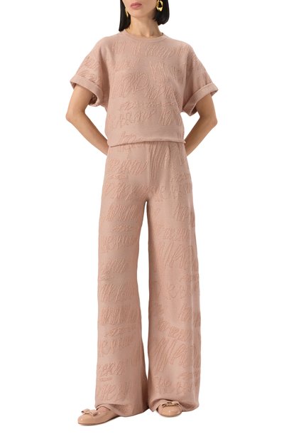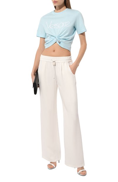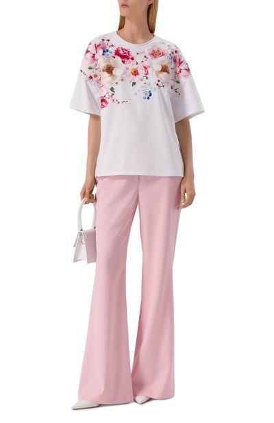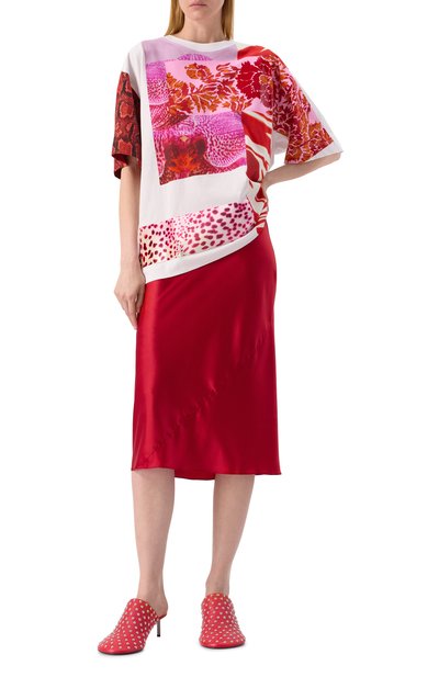 Удлиненную футболку с диагональной линией низа декорировали абстрактным принтом, будто нарисованным кистью и красками. Наши стилисты предлагают оттенить модель базовыми черными брюками.