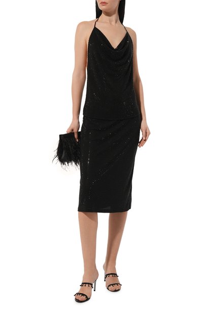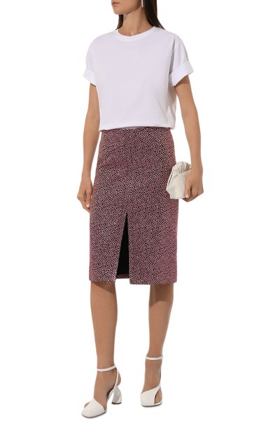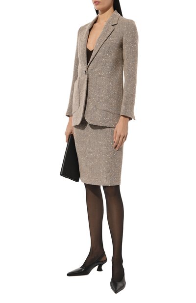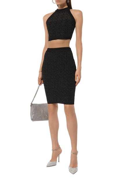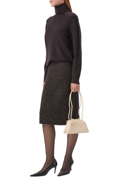 Юбку-карандаш сшили из полушерстяного трикотажа с фактурой и дополнили металлизированными нитями. Наши стилисты предлагают сочетать модель со свитшотом и мюлями.