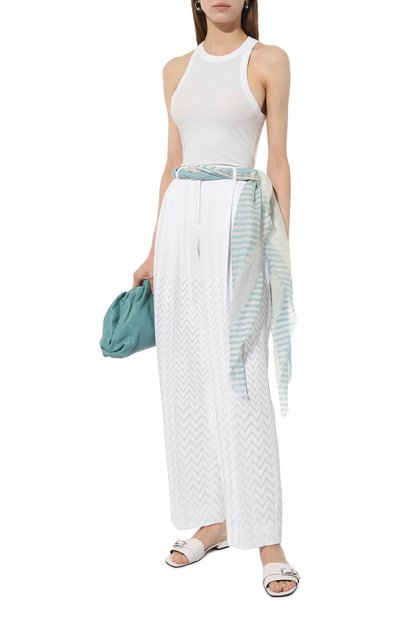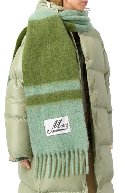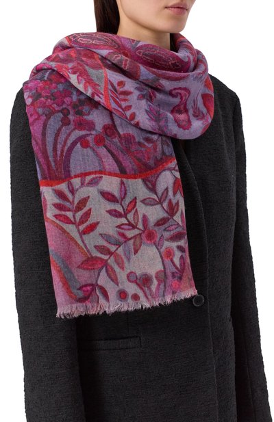 Для пошива палантина с короткой бахромой по краям использовали тонкую шерсть. Абстрактный принт создали вручную, оцифровали и перенесли на аксессуар.