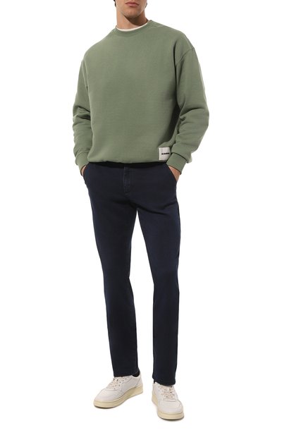Слегка зауженные джинсы с пятью карманами выполнили из хлопкового денима с добавлением полиуретана. Пояс сзади дополнили патчем с брендированной накладкой.