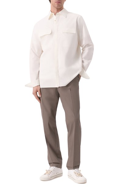Рубашку с карманами в боковых швах сшили из хлопкового поплина. Модель с прямоугольными манжетами на пуговицах застегивается молнией с брендированным пуллером.