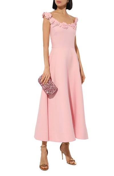 Облегающее платье-корсет на бретелях, с потайной молнией сшили из шелкового шифона с цветочным мотивом. Из такого же полупрозрачного материала выполнили свободную накидку с вырезами для рук, драпированной горловиной и широкими лентами, завязывающимися на бант сзади.