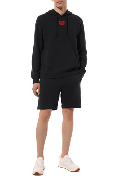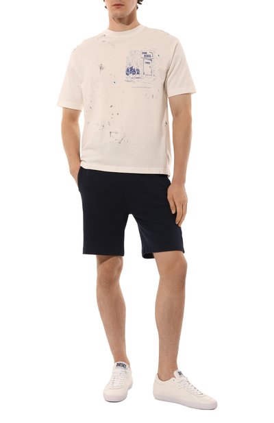 Шорты с поясом-кулиской сшиты из гладкого хлопкового трикотажа. Эластичная модель с тремя врезными карманами украшена сбоку небольшим логотипом марки.