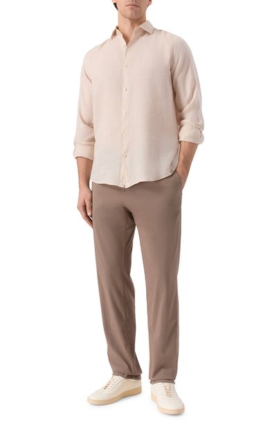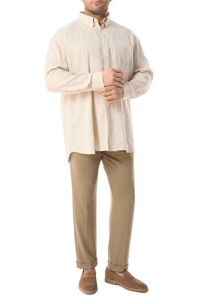 Удлиненную рубашку с фигурным низом и воротником button down дополнили нагрудным карманом. Модель из льняной ткани застегивается перламутровыми пуговицами. Одну из регулируемых манжет украсили вышитой акулой.