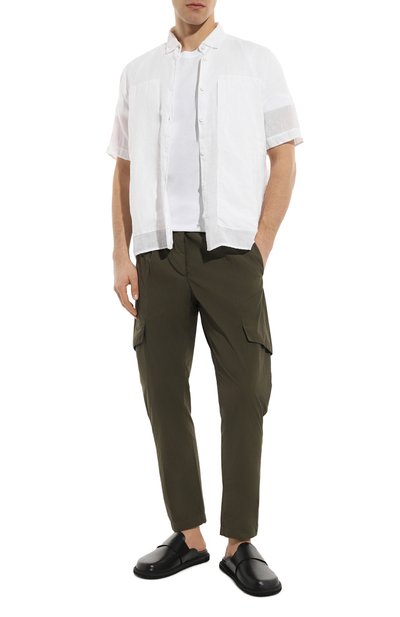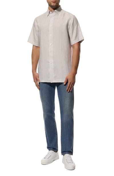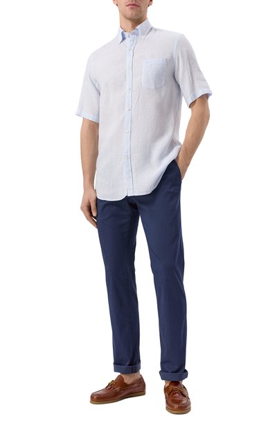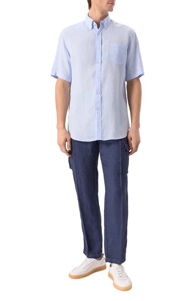 Льняная рубашка с воротником button-down органично впишется в базовый гардероб и подружится с вещами в любой цветовой гамме. Модель с вышитой в тон акулой на нагрудном кармане застегивается перламутровыми пуговицами.