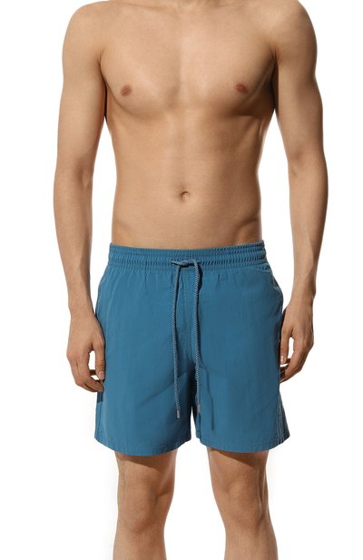 Шорты с эластичным регулируемым поясом-кулиской сшили из быстросохнущего полиэстерового сирсакера. Модель с боковыми и задним накладным карманами украсили брендированными патчами и съемным брелоком в форме акулы.