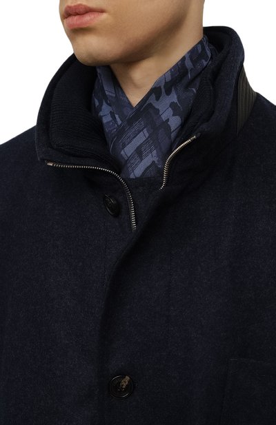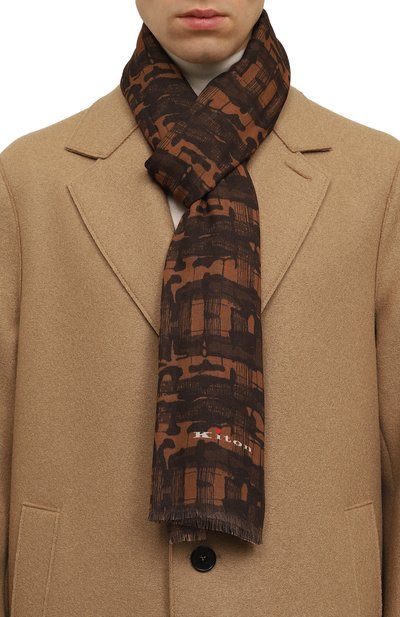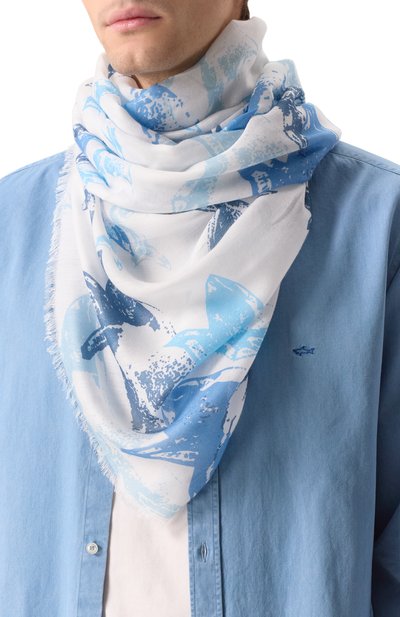 Для изготовления широкого шарфа с короткой бахромой по краям использовали немнущийся твил из модала и лиоцелла. Аксессуар декорировали принтом.