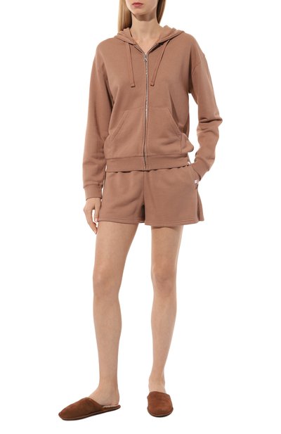 Кроме нейтральных серых свитшотов, джоггеров, халатов и знаковых для бренда пижамных комплектов в клетку и гусиную лапку, в ассортименте марки есть цветные непарные футболки, шорты и удлиненные платья.