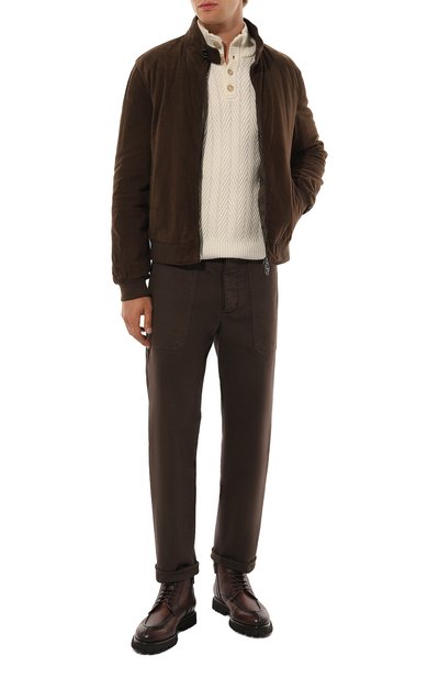 Прямые джинсы с двумя прорезными боковыми и задними накладными карманами сшили из хлопка с добавлением полиамида. Изделие дополнили эластичным поясом, в который продели шнурок. Сзади закр епили брендированный патч.