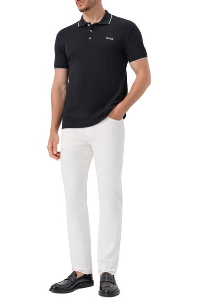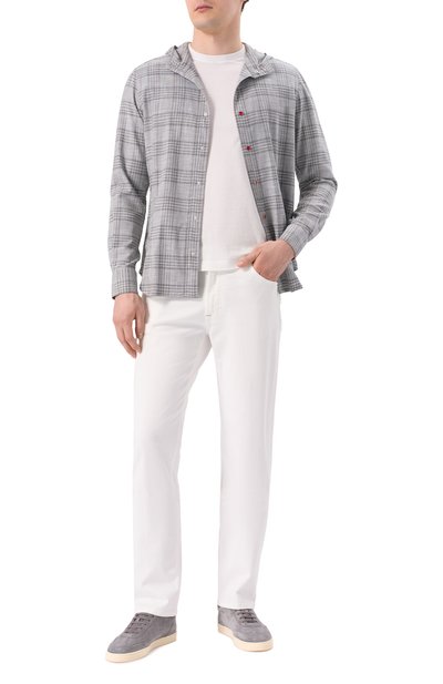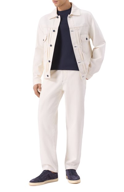 Джинсы сшили из стрейчевого хлопка. Шлевку и один из пяти карманов украсили вышивкой фирменного алого оттенка, а пояс сзади — фирменным кожаным патчем. Ширинку button fly декорировали брендированным ярлыком.
