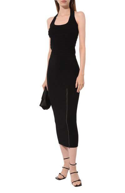 Топ с круглой горловиной и вырезом халтер сшили из сетчатого полиэстерового трикотажа с градиентным рисунком. Кулиску сбоку, подчеркнутую драпировкой, можно регулировать двумя цепочками с фиксаторами и Т-образными эглетами.