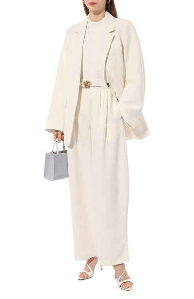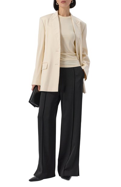Жакет из хлопкового твила с добавлением эластана декорировали контрастным брендированным патчем на левом рукаве. Внутри предусмотрели лямки, позволяющие спустить модель с плеч. Изделие без застежки дополнили боковыми карманами с клапанами.