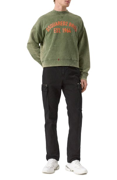 Для изготовления широких брюк с внутренней кулиской на поясе использовали прочный твил. Модель с вышитой сзади эмблемой Oval D дополнили боковыми карманами с молниями, задними с кнопками и четырьмя карго на липучках.