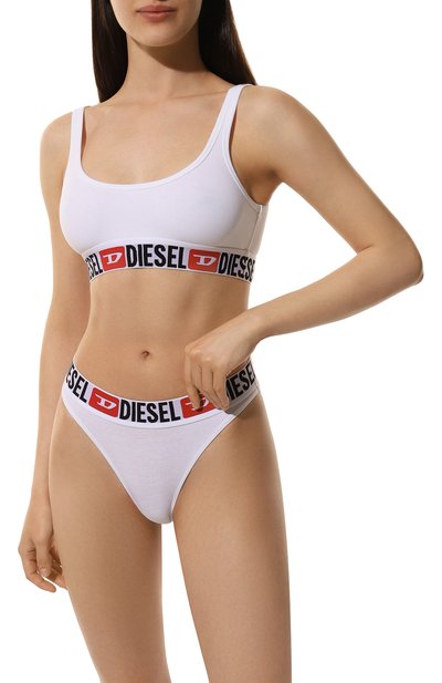 Бра-топ с узкими регулируемыми бретелями сшили из эластичного трикотажа на основе хлопка. Модель без застежки дополнили брендированным поясом-резинкой, поддерживающим грудь.
