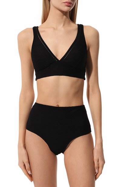 Бра-топ с вырезом на спинке выполнили из нейлона с добавлением эластана. Модель застегивается молнией спереди, скрытой под планками с контрастным логотипом марки.