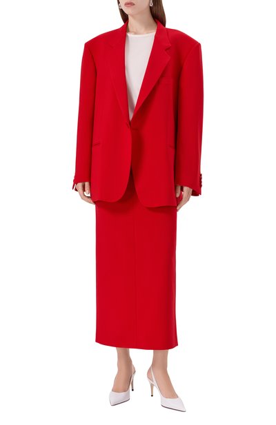 Жакет с одним нагрудным и двумя боковыми карманами впишется в образ с парными брюками. Модель с высокой шлицей сшили из твила malfilé на основе шерсти первого пострига, дополнив изделие подкладом из крепа в тон. Воротник сзади украсили цепочкой мониль.